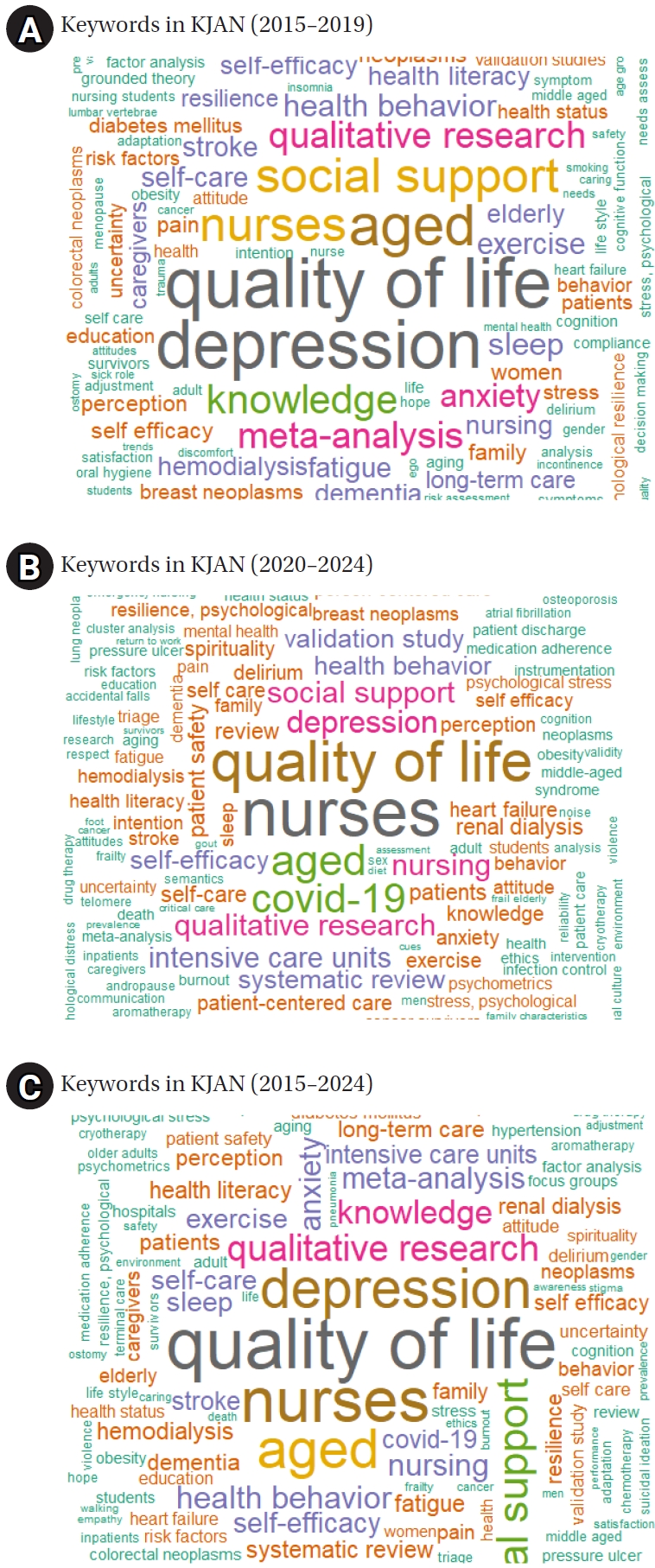 Methods A retrospective review was conducted of research articles published in KJAN between 2015 and 2024. Study designs and methodological characteristics were classified using a structured coding framework and analyzed with descriptive statistics. A text-mining approach incorporating keyword network analysis and latent Dirichlet allocation topic modeling was applied to examine thematic patterns.