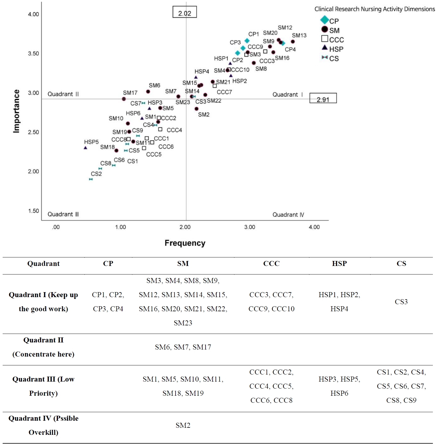 Purpose This study aimed to investigate the frequency and perceived importance of 52 clinical research nursing activities in Korea and to apply importance–performance analysis (IPA) to identify areas requiring improvement. Methods: A descriptive survey was conducted among 96 clinical research nurses (CRNs) with ≥2 years of experience. Data were collected online in May 2022 using a questionnaire addressing 14 general characteristics and 52 clinical research nursing activities across five dimensions: clinical practice (CP), study management (SM), care coordination and continuity, human subjects protection, and contributing to the science (CS), as defined by the US National Institutes of Health (NIH). Frequency and importance were evaluated on a 6-point Likert scale. Analyses included descriptive statistics, Pearson correlation coefficients, the t-test, analysis of variance with Duncan post hoc tests, and IPA. Results: The mean frequency and importance scores for the 52 activities were 2.02±1.27 and 2.91±1.24, respectively. CP activities were performed most often and rated as most important, whereas CS activities were performed least often and rated as least important. Higher education, certification, and professional association membership were associated with higher CS activity frequencies. IPA revealed strengths in CP and core SM activities, while regulatory reporting, data integrity assurance, and site audits were underperformed despite being highly important. Conclusion: Korean CRNs play essential roles in CP and SM but require enhanced education, institutional support, and clearer role delineation in regulatory and quality-assurance activities. These findings provide evidence to guide CRN education, policy development, and the strengthening of professional identity among CRNs in Korea.