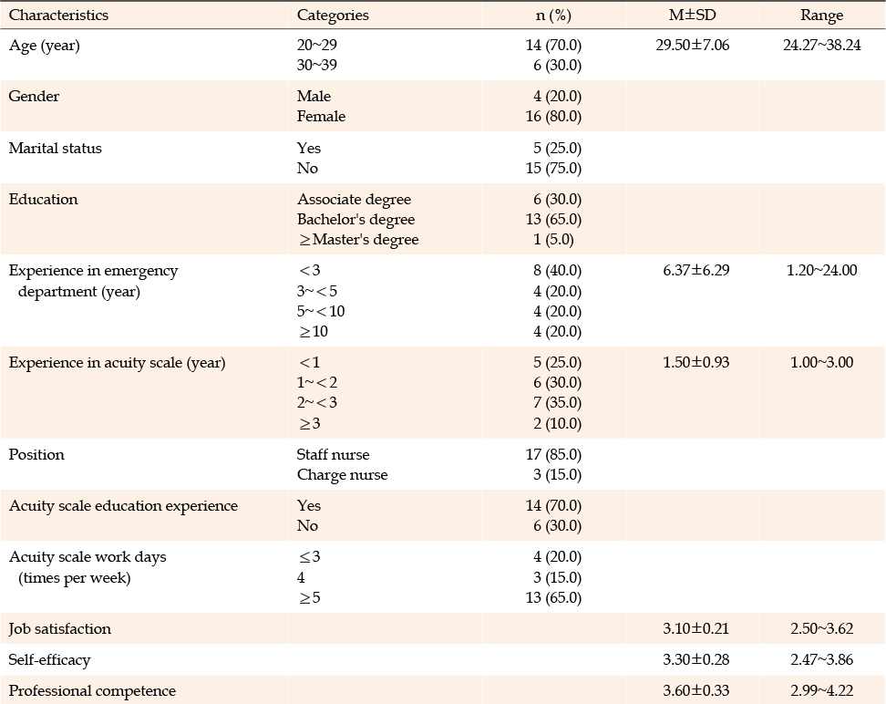 간호사의 연령은 평균 29.50±7.06세이었으며, 30세 이하가 14명(70.0%)으로 가장 많았다. 성별은 여자 16명(80.0%)로 대부분을 차지하였으며, 미혼은 15명(75.0%)이었다. 응급의료기관 근무경력은 평균 6.37±6.29년으로 3년 미만이 8명(40.0%)으로 가장 많았고, 중증도 분류업무 경력은 2~3년 미만이 7명(35.0%)으로 가장 많았다. 직위는 일반간호사 17명(85.0%)으로 가장 많았다. 중증도 분류 관련 교육 경험은 있는 경우가 14명(70.0%)이었다. 간호사의 직무만족도의 평균은 5점 만점에 3.10±0.21점이었으며 자기효능감 점수는 5점 만점에 3.30±0.28점이었다. 전문직 역량 점수는 3.60±0.33점이었다(Table 3).