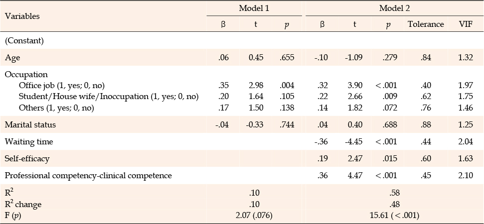 응급의료기관 이용만족도에 영향을 미치는 변수들을 파악하기 위해 회귀분석을 실시하였다. 우선, 단변량 분석에서 유의한 차이를 보인 일반적 특성을 통제하기 위해 변수를 투입한 모델 1은 통계적 유의성이 없었다. 모델 2는 의료서비스 제공 측면과 간호사 특성 측면 중 유의한 상관성을 나타낸 대기시간, 자기효능감, 전문직 역량 세 개의 하위변수를 추가로 투입시킨 것으로, 모델 1에 비해 48.0% 설명력이 높은 것으로 나타났다. 공차한계(tolerance)의 범위가 0.45~0.88로 0.1 이상이었고, Durbin-watson은 유의수준 α가 .05, 사례 수 100, 독립변수 3개의 회귀모델에 대응하는 값을 표에서 찾으면 1.65~1.72로 본 연구결과에서 나타난 1.81은 양의 자기상관이 있는 것으로 볼 수 있었다. 하지만, Durbin-Watson 값이 상한값보다 클 경우 자기상관이 없는 것으로 판단할 수 있다는 근거에 따라[22] 잔차 간에 상관관계가 없는 것으로 판단하였다. 이에 회귀모형이 적합하다고 해석할 수 있다. 대기시간(t=-4.45, p<.001), 간호사의 자기효능감(t=2.47, p<.001), 전문직 역량(t=4.47, p<.001)이 응급의료기관 이용만족도에 영향을 미치는 것으로 나타났다. 즉, 환자의 대기시간이 짧을수록 담당간호사의 자기효능감이 높을수록, 전문직 역량이 높을수록 환자의 응급의료기관 이용만족도가 높아진다고 할 수 있다. 변인들에 의한 설명력은 58%였다(F=15.61, p<.001, R2=.58)(Table 5).