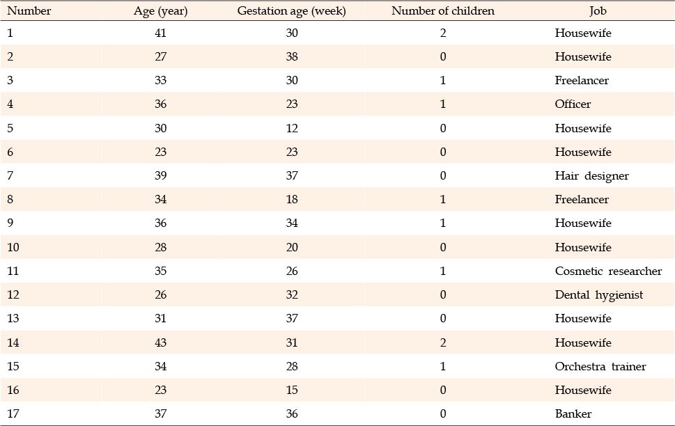 연구참여자 선정기준은 1) 임신 전체 기간에 해당하는 여성, 2) 단태아, 다태아, 자연 임신, 난임 시술 임신 여성, 3) 한국어로 말하고 쓰고 읽기가 가능한 여성, 4) 연구목적과 과정에 동의한 여성이다. 배제기준은 1) 현재 임신으로 인한 모체나 태아의 건강문제가 있는 여성, 2) 현재 임신 이외의 원인으로 모체나 태아의 건강문제가 있는 여성이다. 임부의 선정기준 및 배제 기준은 임부 대상 산전교육 선행연구로부터 모체의 정신건강 문제, 분만합병증, 태아기형, 태아합병증이 있는 경우 연구참여의 어려움이 있다는 근거에 따랐다[17]. 참여자의 수는 인터뷰 방법론 문헌으로부터 충분성이 확보되는 인원으로 10~15명을 계획하였으며, 인터뷰 내용이 포화될 수 있도록 실제 표집된 인원은 20명이며 인터뷰에 응한 참여자는 17명이었다[18]. 참여자의 임신 주수는 12~38주였으며, 연령은 23~43세였으며, 쌍태아 임신 1명, 단태아 임신 16명이었고, 자연임신이 16명, 난임시술 임신이 1명이었고, 17명이 모두 배우자가 있는 기혼여성 이었다(Table 1).