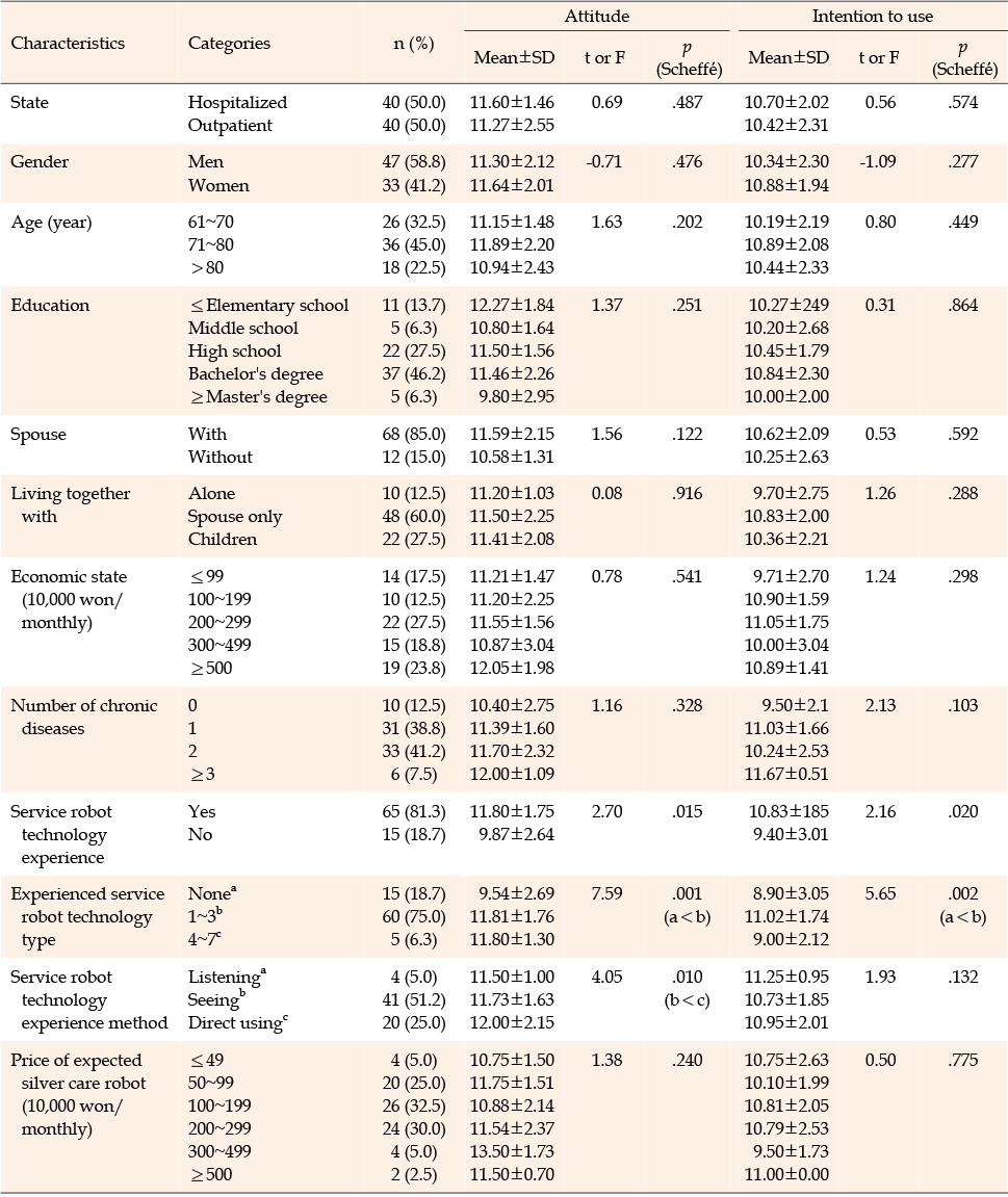 Differences in Attitude toward and Intention to Use for Silver-care Robot Technology according to the General Characteristics of the Older Adults (N=80)