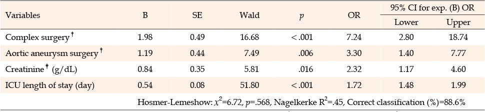 대상자의 일반적 및 임상적 특성에 따른 섬망발생유무에서 유의한 차이를 보였던 변수를 독립변수로 하고, 섬망발생유무를 종속변수로 하여 다변량 로지스틱 회귀분석을 시행한 결과, 두 가지 이상의 수술 병행, 대동맥류 수술, 크레아틴, 중환자실 재실기간 변수에서 유의한 차이를 보였다. 두가지 이상의 수술을 병행한 경우 다른 수술에 비해 섬망발생할 확률이 7.24배 높았고(95% CI=2.80~18.74, p<.001), 대동맥류 수술을 진행한 대상자의 경우 다른 수술에 비해 3.30배 섬망발생확률이 높았다(95% CI=1.40~7.77, p=.006). 혈청 크레아틴의 경우 정상범위(≤1.2 g/dL)를 벗어난 대상자가 정상 범위인 대상자에 비해 2.32배(95% CI=1.17~4.60, p=.016), 중환자실 재실기간의 경우 재실기간이 하루 길어질수록 1.72배(95% CI=1.48~1.99, p<.001) 섬망발생위험이 높은 것으로 나타났다. 로지스틱 회귀분석 모형은 Hosmer-Lemeshow 모형적합도 검정을 시행한 결과 적합한 것으로 나타났으며(χ2=6.72, p=.568), 모형의 종속변수에 대한 설명력은 45% (Nagelkerke R2=.45), 섬망 유무에 대한 분류 정확도는 88.6%였다(Table 4).