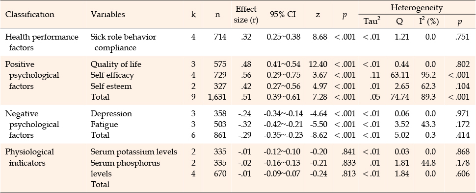 메타 분석을 실시한 요인은 건강이행 관련 행위 요인 8개 중 1개 요인(환자역할 수행도), 긍정적 심리 관련 요인 6개 중 3개 요인(삶의 질, 자기효능감, 자아존중감), 부정적인 심리 · 신체적 관련 요인 7개 요인 중 2개 요인(우울, 피로), 생리적 지표 관련요인은 2개 모두(혈중 칼륨, 혈중 인)이었다.