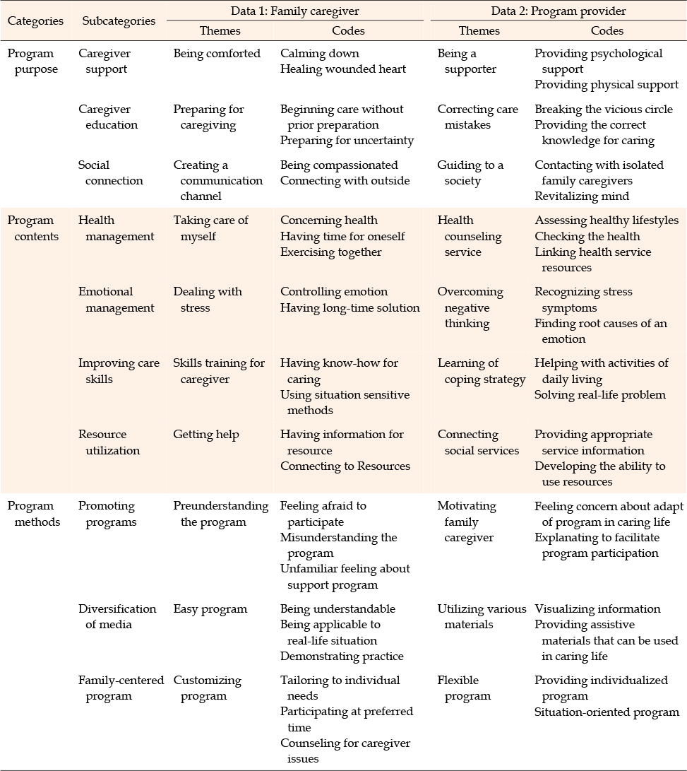 The data were deductively analyzed within three main categories: program purpose, program content, and program method. Within the main categories, ten subcategories represented the essential elements for developing a family support program. There were differences between family caregivers and program providers in terms of the contents and intentions of the family support program. Family caregivers wanted to receive help from the family support program in a passive manner, while program providers expected the family support program to improve families' ability to solve their own problems.