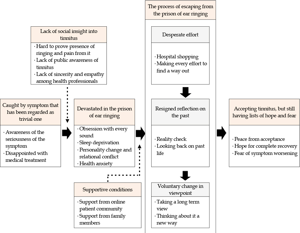 Data were collected from October 2017 to March 2018 through individual in-depth interviews with 15 tinnitus patients. Verbatim transcripts and field notes were analyzed using grounded theory methodology developed by Corbin and Strauss.