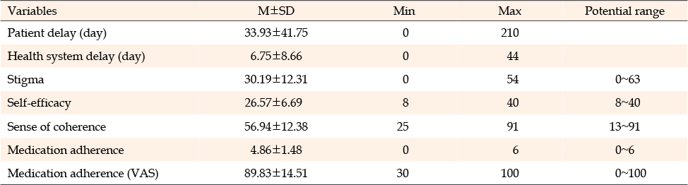 대상자의 치료지연 중 환자지연은 평균 33.93±41.75일이었으며 최소 0일에서 최대 210일로 매우 다양하게 나타났고, 의료기관지연은 평균 6.75±8.66일이었다. 낙인 정도는 총 63점 만점에 평균 30.19±12.31점, 자기효능감은 40점 만점에 평균 26.57±6.69점, 통합력은 91점 만점에 평균 56.94±12.38점이었다. 복약이행을 Bae 등[25]의 도구로 측정한 점수(6점 만점)는 평균 4.86±1.48점으로, 약물 순응군은 50.8%, 비의도적 비순응군은 33.1%, 의도적 비순응군은 16.1%로 분류되었고, VAS (100점 만점)로는 평균 89.83±14.51점이었다(Table 2).