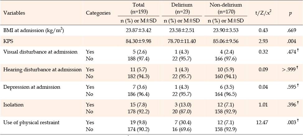 Comparison of Physical and Environmental Characteristics between the Delirium and Non-delirium Groups (N=193)