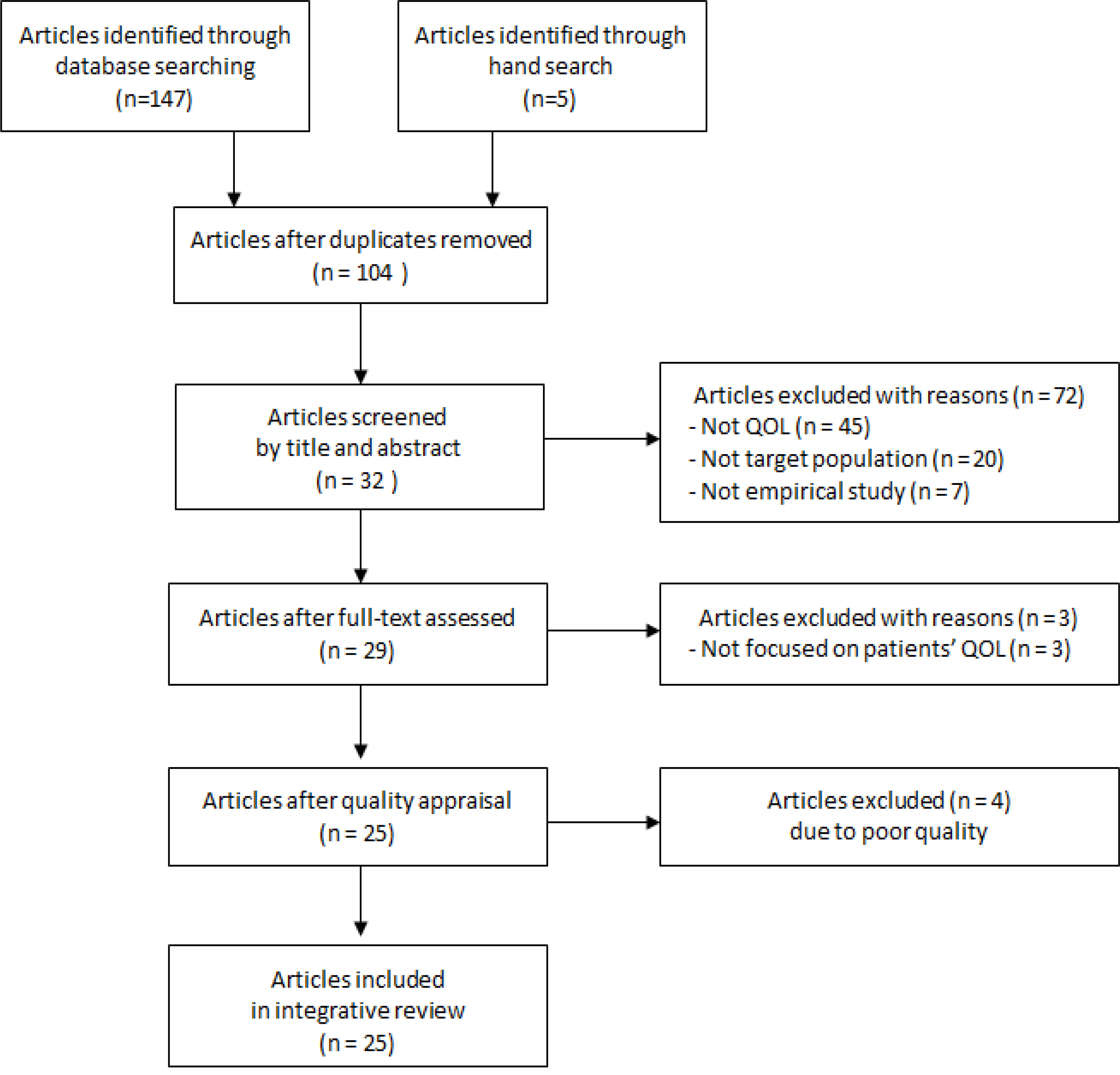 통합적 고찰(integrative review) 연구방법은 기존의 체계적 문헌고찰에서 보다 확대된 개념으로서, 연구의 편향으로부터 보호하고 특정 현상에 대한 개요와 정확한 결론을 도출하도록 하여 주제에 대해 보다 깊이 이해할 수 있게 해준다[13]. 삶의 질에 대한 개념은 오랜 시간 논의된 주제이지만 말기암 환자의 삶의 질에 대한 중재연구가 많지 않아 메타분석이 적합하지 않고, 말기암 환자의 삶의 질과 관련된 양적 연구 뿐 아니라 질적 연구까지 포함하여 비교하고 대조하여 통합적으로 고찰하기 위해서는 통합적 고찰 방법이 적합하다고 할 수 있다[14]. 인구가 고령화되고 암 생존률 및 말기암 환자가 증가하는 시점에서 국내 말기암 환자의 삶의 질 연구가 어디까지 이루어졌는지에 대한 전반적인 정리와 고찰이 필요하며, 이러한 고찰 결과 밝혀진 내용들은 향후 말기암 환자의 삶의 질 향상을 위한 근거 기반 중재개발의 기초자료에 도움이 될 것이다.