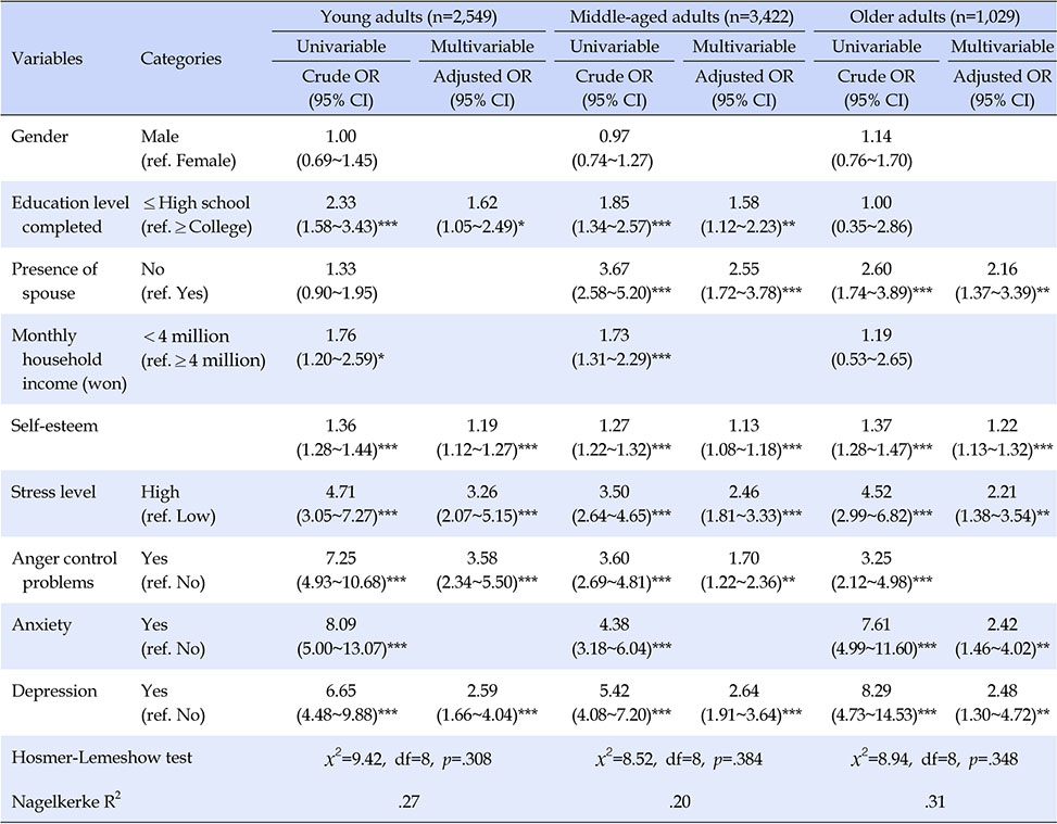 The factors associated with suicidal ideation among the young adult group were education level (odds ratio [OR] 1.62, 95% confidence interval [CI] 1.05~2.49), self-esteem (OR 1.19, 95% CI 1.12~1.27), stress (OR 3.26, 95% CI 2.07~5.15), anger control problems (OR 3.58, 95% CI 2.34~5.50), and depression (OR 2.59, 95% CI 1.66~4.04) whereas among the middle-aged adults the factors were education level (OR 1.58, 95% CI 1.12~2.23), existence of a spouse (OR 2.55, 95% CI 1.72~3.78), self-esteem(OR 1.13, 95% CI 1.08~1.18), stress (OR 2.46, 95% CI 1.81~3.33), anger control problems (OR 1.70, 95% CI 1.22~2.36), and depression (OR 2.64, 95% CI 1.91~3.64). Among the older adult group the findings were the existence of a spouse (OR 2.16, 95% CI 1.37~3.39), self-esteem(OR 1.22, 95% CI 1.13~1.32), stress (OR 2.21, 95% CI 1.38~3.54), anxiety (OR 2.42, 95% CI 1.46~4.02), and depression (OR 2.48, 95% CI 1.30~4.72).