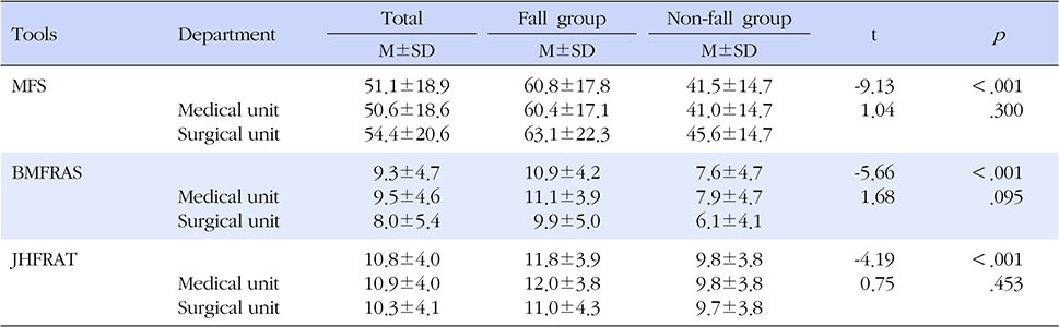 The MFS with the highest score and the highest discrimination was evaluated to be suitable and reasonable for predicting falls of inpatients in med-surg units of university hospitals.
