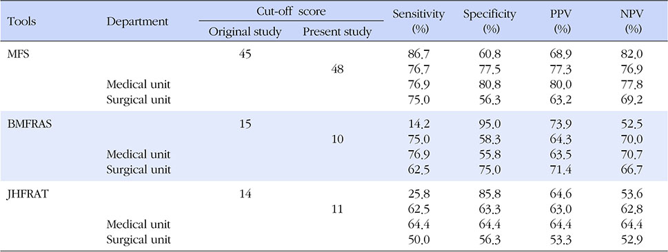 A total of 120 patients who experienced fall episodes during their hospitalization from June 2010 to December 2013 was categorized into the fall group. Another 120 patients, who didn't experience fall episodes with age, sex, clinical departments, and the type of wards matched with the fall group, were categorized to the comparison group. Data were analyzed for the comparisons of sensitivity, specificity, positive and negative predictive values, and the area under the curve of the three tools.