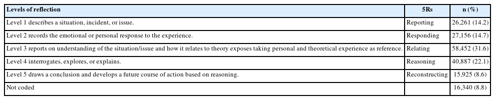 Levels of reflection were analyzed using MAXQDA software by examining word frequencies and percentage of text coverage. All researchers reviewed divergent interpretations, discussed the defining properties of each subcategory and category, and reached a consensus through group discussions.