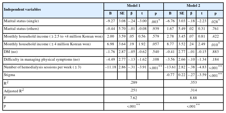 Multiple linear regression was conducted to examine the association between stigma and self-management, controlling for demographic and clinical characteristics. A two-step hierarchical regression model was used, with self-management as the dependent variable. In Model 1, demographic and clinical characteristics—including marital status, monthly household income, diabetes mellitus, difficulty in managing physical symptoms, and number of hemodialysis sessions per week—explained 25.1% of the variance in self-management (F=7.62, adjusted R²=.251) (