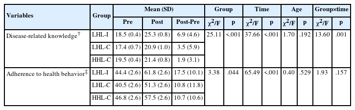 Table 3.Changes in Disease-Related Knowledge and Adherence to Health Behavior between Pretest and Posttest Based on Health Literacy Levels