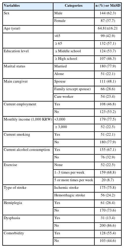 General characteristics included 10 items regarding participants’ sex, age, education level, marital status, primary caregiver, employment status, monthly income, smoking and alcohol consumption, and physical exercise prior to hospitalization. Disease characteristics consisted of five items on the frequency of stroke occurrence, type of stroke, presence of paralysis, presence of other diseases, and presence of language disorders.