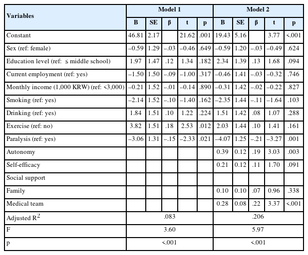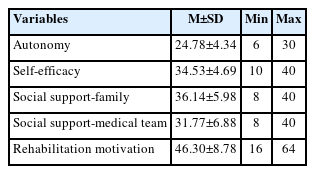 Table 2. The mean autonomy score was 24.78±4.34 (range, 6–30), and the mean self-efficacy score was 34.53±4.69 (range, 10–40). For social support, the mean scores were 36.14±5.98 (range, 8–40) for family support and 31.77±6.88 (range, 8–40) for medical team support. The mean rehabilitation motivation score was 46.30±8.78 (range, 16–64).