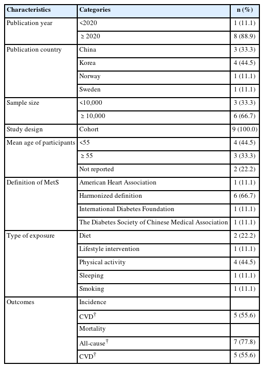 Of the nine cohort studies, eight (88.9%) were published after 2020. Four studies (44.5%) were conducted in South Korea and three (33.3%) were conducted in China. Six studies (66.7%) included sample sizes exceeding 10,000 participants, and three studies (33.3%) reported a mean age of 55 years or older. The harmonized criteria were used to define MetS in six studies (66.7%), while the AHA, IDF, and Diabetes Society of the Chinese Medical Association criteria were each applied in one study (11.1%). Regarding exposures, physical activity was most frequently investigated (four studies, 44.5%), followed by diet (two studies, 22.2%), with lifestyle intervention, sleep, and smoking each examined in one study (11.1%). For outcomes, five studies (55.6%) reported both CVD incidence and CVD mortality, and seven studies (77.8%) reported all-cause mortality (