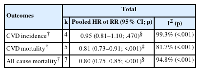 20], and pooled using random-effects models. For CVD incidence and all-cause mortality, when both HR and RR were available, HR was assumed to approximate RR under conditions of low baseline event risk; thus, RR values after log transformation were used [