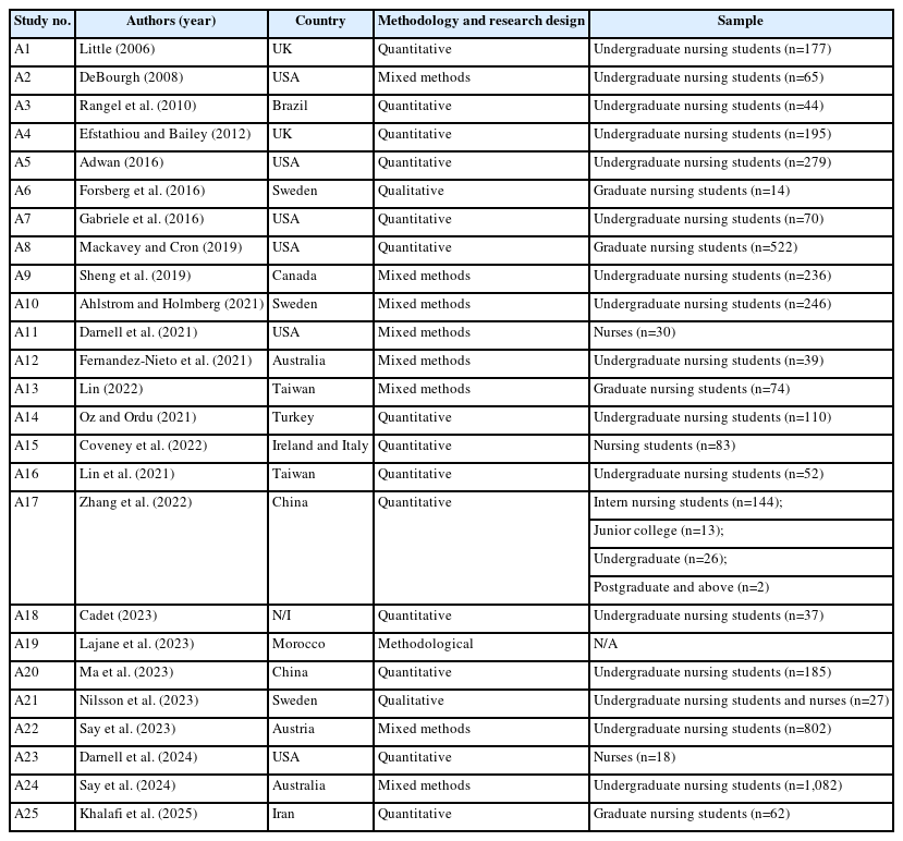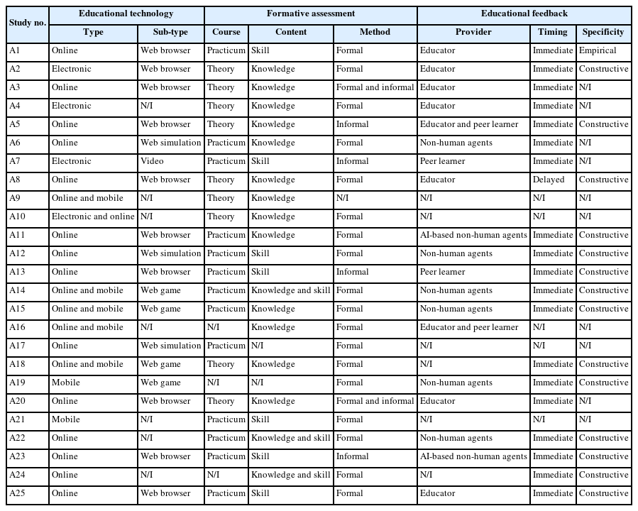 Supplementary Data 1). Of these, nine articles were published between 2006 and 2019 [A1-9], and 16 were published between 2020 and 2025 [A10-25]. Articles published in the last five years accounted for more than half of the included studies (n=16), indicating growing interest in educational technology-based formative assessment in nursing education. Geographically, among the 25 articles, one study [A18] did not report identifiable geographic information, while the remaining 24 articles were conducted in the following locations: six in the USA [A2,A5,A7,A8,A11,A23]; three in Sweden [A6,A10,A21]; two each in Australia [A12,A24], China [A17,A20], Taiwan [A13,A16], and the UK [A1,A4]; and one each in Austria [A22], Brazil [A3], Canada [A9], Iran [A25], Morocco [A19], and Turkey [A14]. In addition, one study was conducted jointly in Ireland and Italy [A15]. Quantitative studies were the most common (n=14) [A1,A3-5,A7,A8,A14-18,A20,A23,A25], followed by mixed-methods studies (n=8) [A2,A9-13,A22,A24], qualitative studies (n=2) [A6,A21], and one methodological study (n=1) [A19]. Among the 25 reviewed articles, excluding the methodological study, participant characteristics in the remaining 24 articles showed that 21 studies involved nursing students [A1-10,A12-18,A20,A22,A24,A25], two involved nurses [A11,A23], and one included both nursing students and nurses [A21].
