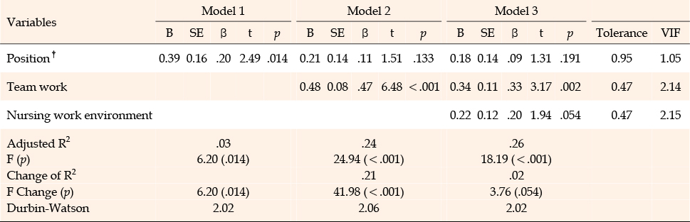 To identify factors affecting person-centered care among nurses in tertiary hospitals caring for COVID-19 patients, we entered position variables significantly associated with person-centered care among the general characteristics as dummy variables based on staff nurses. The results of the hierarchical multiple regression analysis with nursing work environment and team work, which showed a statistically significant correlation with person-centered care based on the statistical significance level (p<.050), are shown in Table 4.