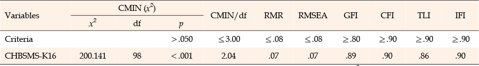 CHBSMS-K16의 내적 일관성 신뢰도는 만족할 만한 수준이었고 원 도구 개발 당시 CHBSMS의 내적 일관성 신뢰도 Cronbach’s α는 .89 [15]와 유사한 수준이다. 각 하위 요인의 신뢰도 계수도 확보되어 문항들이 측정개념을 일관성 있게 측정하고 있음을 보여준다. 문항-총점 간 상관계수는 r=.40 이상 시 적합하다는 기준[28]을 모두 만족하였다. 이러한 결과는 CHBSMS-K16가 신뢰할 수 있는 도구임을 의미한다. 본 연구의 제한점으로는 병원을 방문하여 진료를 받거나 인터넷 카페를 통해 활동하는 제한된 수의 편의 표집된 환자를 대상으로 연구를 진행하여 문항 응답의 편중이 있을 수 있으므로 결과를 일반화하는데 제한이 따른다.