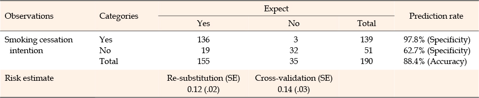 의사결정나무를 이용한 국내 중국 유학생의 금연의도 분류에 대한 교차 타당성 평가 및 예측모형의 정확도를 확인한 결과는 Table 2와 같다. 교차 타당성 평가를 통해 얻어진 위험도표에서 재치환 위험추정치(risk estimate)는 0.12로, 10-fold 교차 타당성 검사에 의해 제시된 평균 위험추정치 값인 0.14로 거의 차이가 없고, 정확도는 88.4%로 나타나 본 연구에서 구축된 모형의 안정성이 확인되었다.