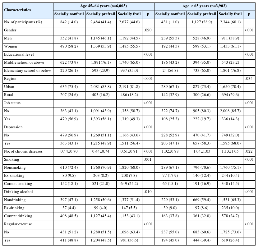 1. General Characteristics of Participants by Social Frailty and Age Group at Baseline (2006)