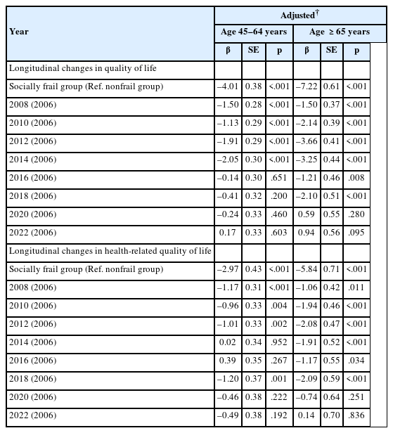The GEE analysis evaluated longitudinal changes in QoL and HRQoL from 2006 to 2022 according to social frailty status (