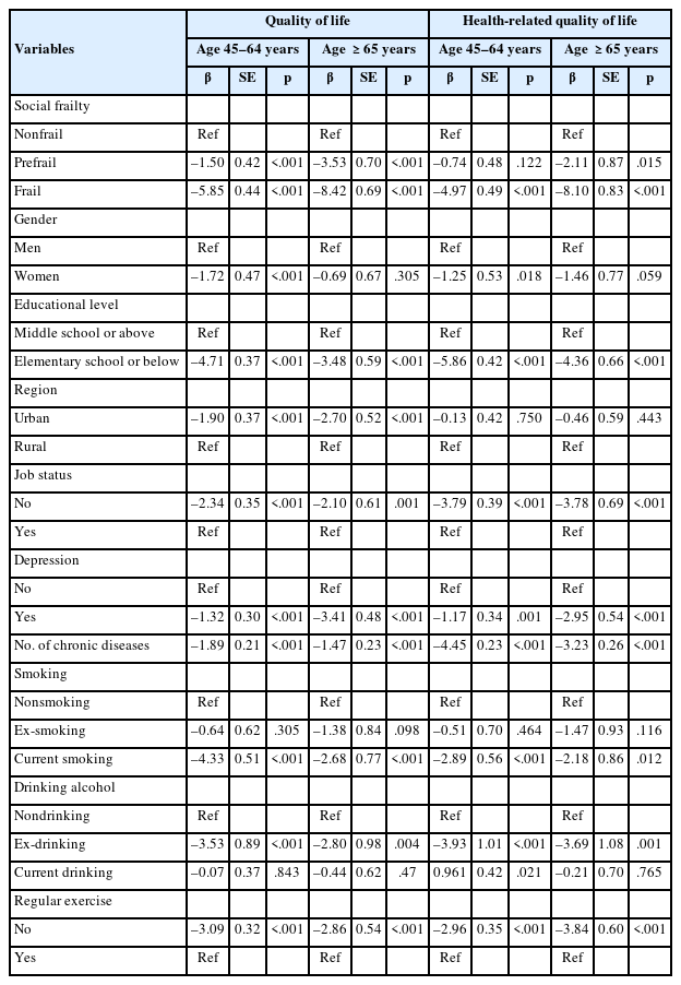 Social frailty was prevalent among both middle-aged (44.6%) and older adults (60.1%) and was significantly associated with lower QoL and HRQoL. In longitudinal analyses, declines in QoL and HRQoL persisted throughout the follow-up period in older adults, whereas in middle-aged adults, the declines were significant only during the earlier years. In middle-aged adults, current smoking exerted a stronger negative impact on QoL and HRQoL (QoL: β=–4.33, p<.001; HRQoL: β=–2.89, p<.001), while in older adults, lack of regular exercise had a greater effect on HRQoL (β=–3.84, p<.001).