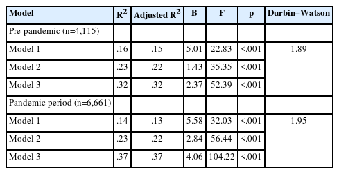 All analyses were conducted using IBM SPSS/WIN Statistics ver. 24.0 (IBM Corp., Armonk, NY, USA). The general and disability-related characteristics of participants were analyzed using frequency analysis, and group homogeneity was verified using the chi-square test. Differences between the pre-pandemic and pandemic periods in disability acceptance, self-esteem, depression, crisis coping, and life satisfaction were assessed using the independent samples t-test. Correlations among variables were examined using Pearson’s correlation analysis. Hierarchical regression analysis was employed to sequentially introduce independent and mediating variables while controlling for confounding effects. Finally, path analysis was performed using Hayes’s (2022) PROCESS Macro for SPSS (ver. 4.2, model 6) to test multiple mediation effects of self-esteem, depression, and crisis coping on the relationship between disability acceptance and life satisfaction.