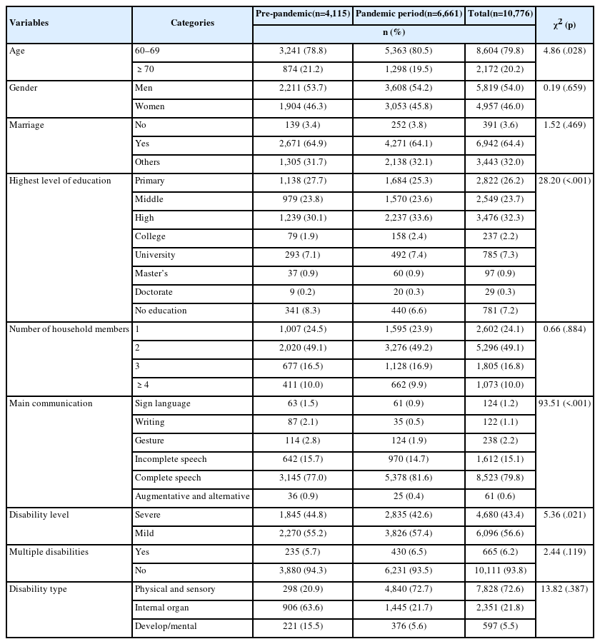 Participants were individuals with registered disabilities aged 60 years or older, based on an age classification reflecting the early aging characteristics commonly observed among people with disabilities. For analytical purposes, the data were divided into two temporal groups: the pre-pandemic period (2018–2019) and the pandemic period (2020–2022). The pre-pandemic dataset included 4,115 cases, and the pandemic dataset included 6,661 cases.