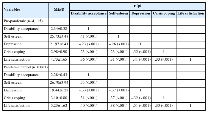 This study aimed to analyze the multiple mediating effects of self-esteem, depression, and crisis coping on the relationship between disability acceptance and life satisfaction among older adults with disabilities, comparing periods before and during the coronavirus disease 2019 pandemic.