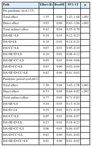 Both the direct and indirect effects of disability acceptance on life satisfaction were significant, indicating partial mediation. In the pre-pandemic period, approximately 60% of the total effect was attributable to the direct effect and 40% to the indirect effect. During the pandemic, the proportion shifted, with the direct effect decreasing to 49% and the total indirect effect increasing to 51%.