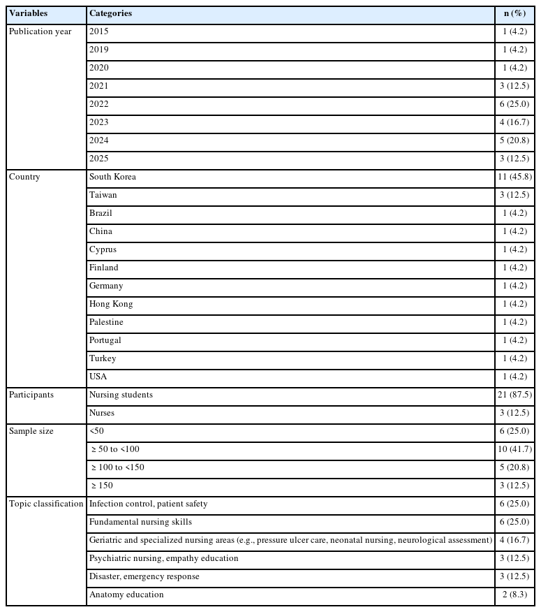 Among the 24 included studies, the most common topics were infection control and patient safety [A3,A6,A7,A12,A14,A16] and basic nursing skills [A2,A4,A8,A11,A15,A23], each addressed in six studies (25.0%). Four studies (16.7%) focused on geriatric and specialized nursing areas, such as pressure ulcer care, neonatal care, and neurological assessment [A1,A19-21]. Three studies (12.5%) each examined mental health nursing and empathy education [A5,A22,A24] or disaster and emergency response [A9,A10,A17]. Anatomy education was the topic of two studies (8.3%) [A13,A18].