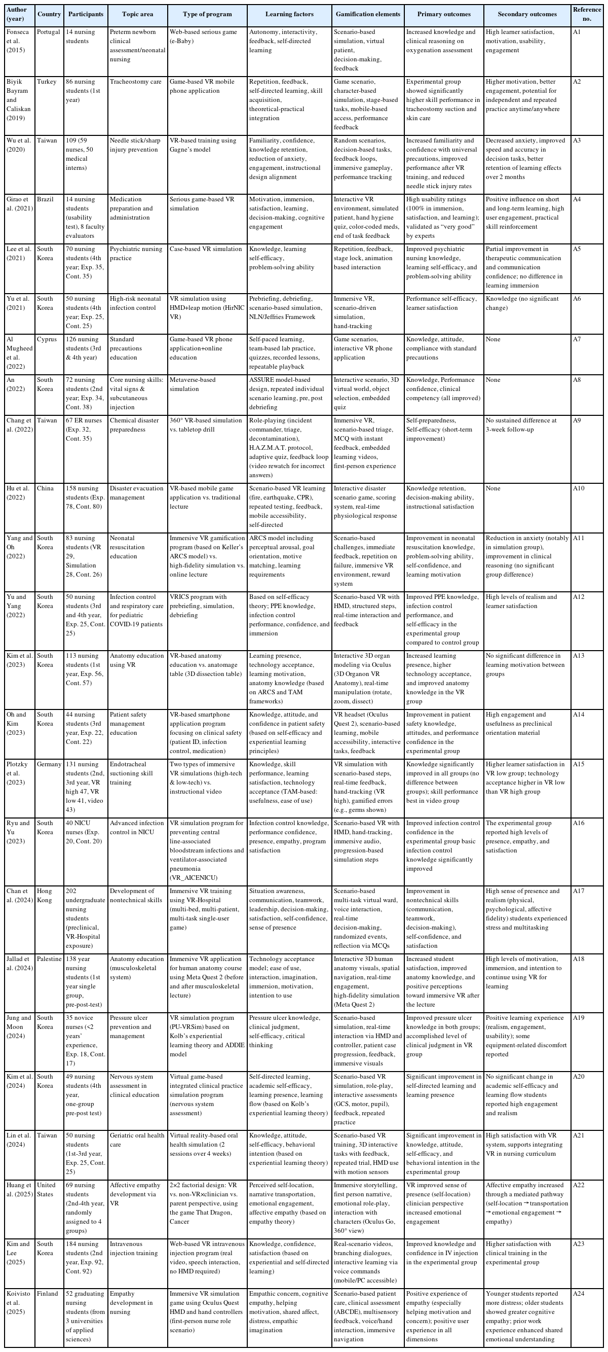 Most of the 24 included studies targeted nursing students, with some involving practicing nurses. Interventions primarily employed immersive VR head-mounted displays and incorporated diverse game elements such as mission-based scenarios, challenges, feedback loops, and virtual patient interactions. Educational effects were categorized into cognitive, affective, and psychomotor domains. Improvements in knowledge acquisition, self-efficacy, learning motivation, and skill performance were consistently reported. Additionally, most studies reported enhanced learner satisfaction, engagement, and emotional immersion. However, limited evidence was found regarding teamwork and communication skills.