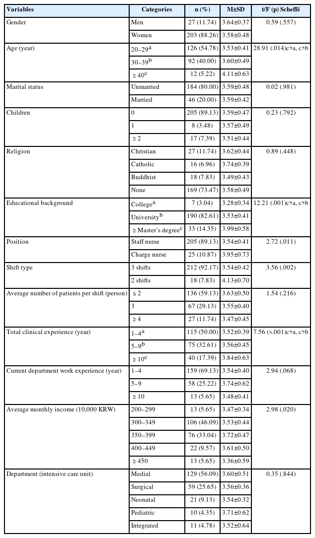 The sample consisted of 230 ICU nurses employed in the ICUs of a tertiary general hospital in South Korea, each with at least one year of direct patient care experience. According to Benner [