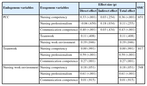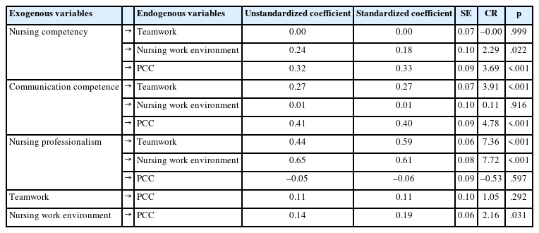 Statistically significant pathways were identified from nursing competency to the nursing work environment and person-centered care; from communication competence to teamwork and person-centered care; from nursing professionalism to teamwork and the nursing work environment; and from the nursing work environment to person-centered care. Nursing professionalism indirectly influenced person-centered care through teamwork and the nursing work environment.