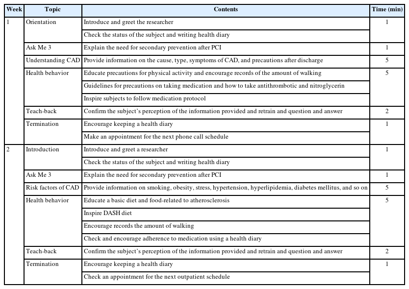 Recruitment took place at a university hospital in Seoul from March to August 2021. The target population comprised adult patients diagnosed with CAD who were hospitalized and had undergone PCI for the first time, with the ability to communicate via telephone. Among those who met the inclusion criteria, patients planning to participate in a CR program within one month after discharge, those who experienced severe arrhythmia following the procedure, and those with musculoskeletal or chronic obstructive pulmonary disease limiting physical activity were excluded.