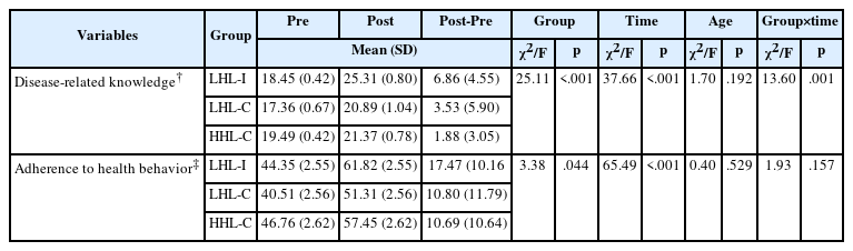 Table 3.Changes in Disease-Related Knowledge and Adherence to Health Behavior between Pretest and Posttest Based on Health Literacy Levels