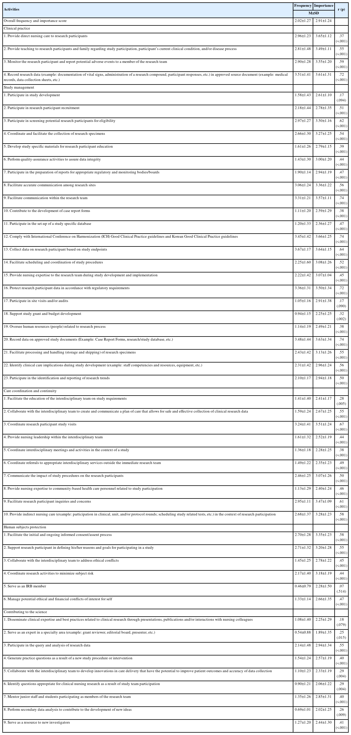 Table 2 presents the frequency, perceived importance, and correlation of clinical research nursing activities. The overall mean frequency score for the 52 activities was 2.02±1.27. The most frequently performed activity was “Collect data on research participant based on study endpoints (SM13)” (3.67±1.17), whereas the least frequently performed activity was “Serve as an IRB member (HSP5)” (0.46±0.79). The overall mean importance score was 2.91±1.24. The highest-rated activity in terms of importance was “Comply with International Conference on Harmonization (ICH) Good Clinical Practice guidelines and Korean Good Clinical Practice guidelines (SM12)” (3.66±1.25), while the lowest-rated activity was “Serve as an expert in a specialty area (e.g., grant reviewer, editorial board, presenter, etc.) (CS2)” (1.89±1.35).
