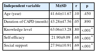 p=.450), and duration of CAPD therapy was not correlated with self-care quality (r=.05,