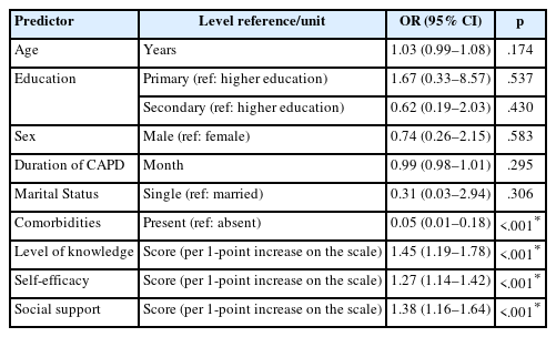 Univariate logistic regression analysis showed that for each one-point increase in score, the odds of being classified in the “good” self-care quality category increased by 45% for knowledge (OR, 1.45; 95% CI, 1.19–1.78; p<.001), 27% for self-efficacy (OR, 1.27; 95% CI, 1.14–1.42; p<.001), and 38% for social support (OR, 1.38; 95% CI, 1.16–1.64; p<.001). Conversely, the presence of comorbidities was associated with substantially lower odds of good self-care quality (OR, 0.05; 95% CI, 0.01–0.18; p<.001). For age, the OR was 1.03 per additional year (95% CI, 0.99–1.08; p=.174). For education level, the OR was 1.67 for primary education (95% CI, 0.33–8.57; p=.537) and 0.62 for secondary education (95% CI, 0.19–2.03; p=.430), both relative to higher education. Male sex, compared with female sex, was not significantly associated with self-care quality (OR, 0.74; 95% CI, 0.26–2.15; p=.583). Similarly, single marital status compared with married status showed no significant association (OR, 0.31; 95% CI, 0.03–2.94; p=.306). Duration of CAPD therapy was also not significantly associated with self-care quality, with an OR of 0.99 per additional month (95% CI, 0.98–1.01; p=.295).